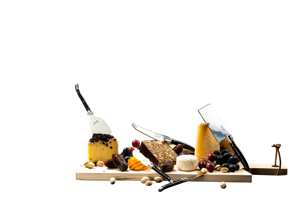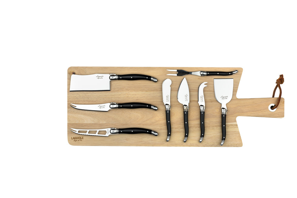 De Laguiole Premium Line 8 Kaasmessen Zwart met serveerplank zijn een stijlvolle en praktische aanvulling op iedere borreltafel. Deze complete set is ontworpen zodat iedere kaas, tapenade of dip zijn eigen mes heeft. Perfect voor zomerse borrels in de tuin of feestjes aan de keukentafel.