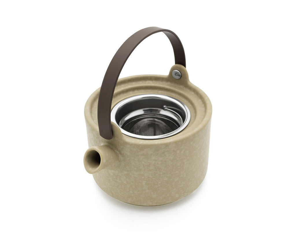 De set is uitgevoerd in een stijlvolle leemgrijze kleur en voorzien van een acacia deksel, wat een Scandinavische en moderne uitstraling geeft. Gemaakt van hoogwaardig keramiek en inclusief een RVS filter, zodat je eenvoudig losse thee kunt zetten zonder gedoe.