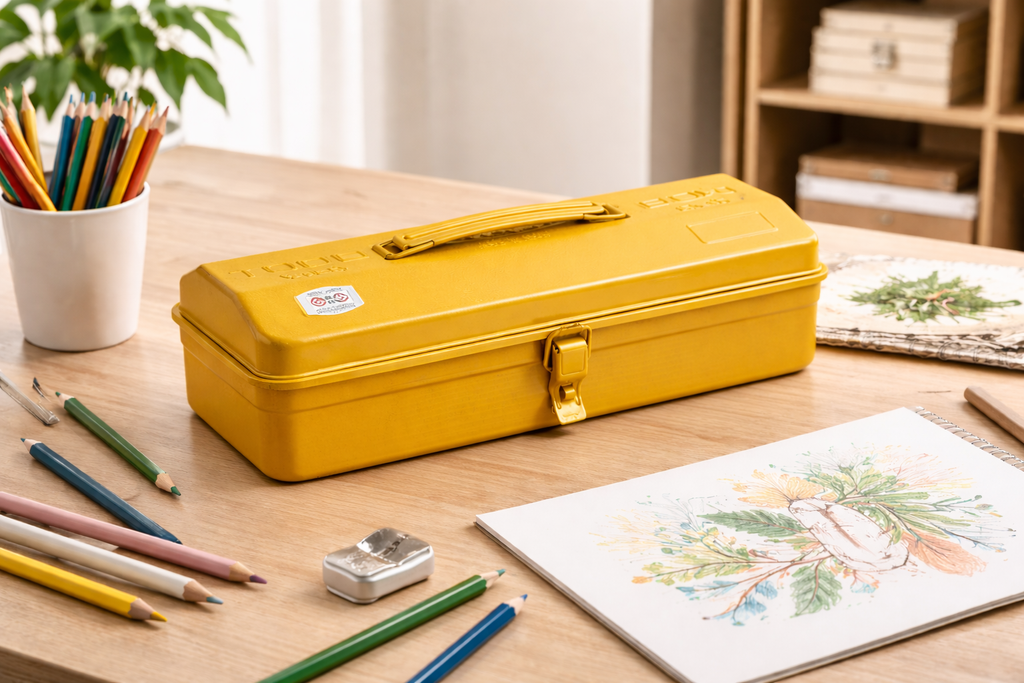 Alle details zijn zorgvuldig doordacht: afgeronde hoeken om verwondingen te voorkomen, een intrekbare handgreep, een vergrendelingslus en reliëf aan de boven- en onderzijde waardoor meerdere toolboxen stabiel te stapelen zijn. De Toyo Steel toolbox vindt zijn plek in elke ruimte van het huis — ideaal voor het opbergen van potloden, naaigerei, telefoons, brillen, keukengerei en natuurlijk gereedschap.