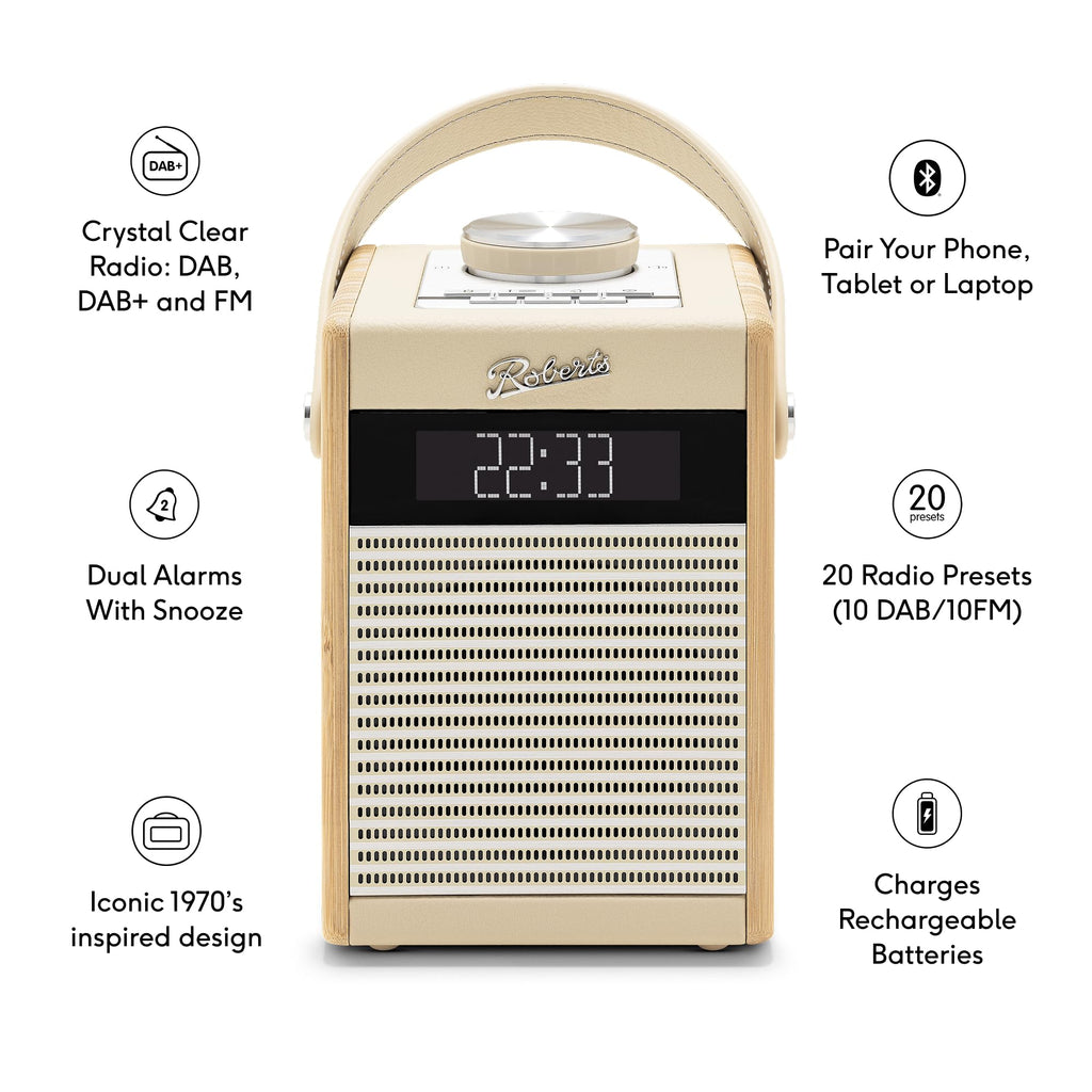 De Rambler Midi Pastel Cream van Roberts combineert vintage elegantie met hedendaagse technologie. De zachte beige tint, in combinatie met bamboepanelen en een geborstelde aluminium grille, zorgt voor een warme en stijlvolle uitstraling.